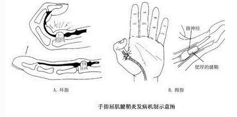 屈肌腱腱鞘炎,最常见于拇、食、中三指的屈肌腱腱鞘,发生在无多指、小指者较少。发病后患者感到: