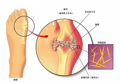 痛风是嘌呤代谢异常致使尿酸合成增加而导致的代谢性疾病,痛风早期易与类风湿性关节炎相混淆。痛风多见于男性,好发部位第一跖趾关节也可侵犯踝、膝、肘、腕及手指等关节。发作时多急骤起病,数小时内出现红、肿、热、痛、疼痛剧烈时不能触,同尿酸血症,尿酸结晶沉积于关节附近或皮下,形成痛负结节。结节逐渐增大,致使局部畸形及骨质破坏。血清尿酸常在357μmol(6mg/dl)以上,关节腔穿刺或结节活检,可见到针状尿酸结晶。