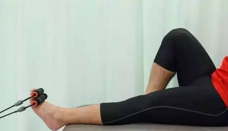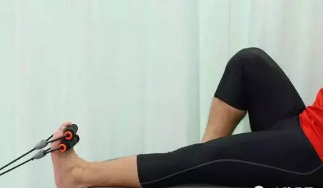 以皮筋为阻力,远端固定,套在脚上,从伸直位尽量用力勾到屈曲位,稍作停顿,慢慢放开,反复做20次,休息30秒,共做4-6组,每天1-2次。
