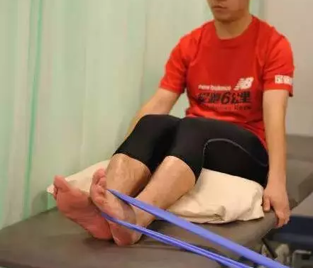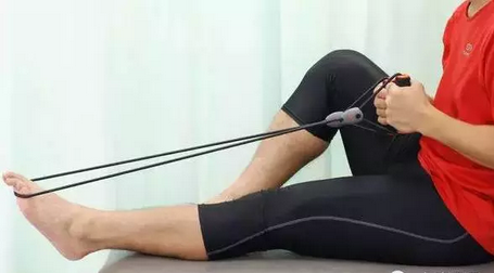 以皮筋为阻力,近端固定(手握),套在脚上,从屈曲位尽量用力绷到伸直位,稍作停顿,慢慢放开,反复做20次,休息30秒,共做4-6组,每天1-2次。